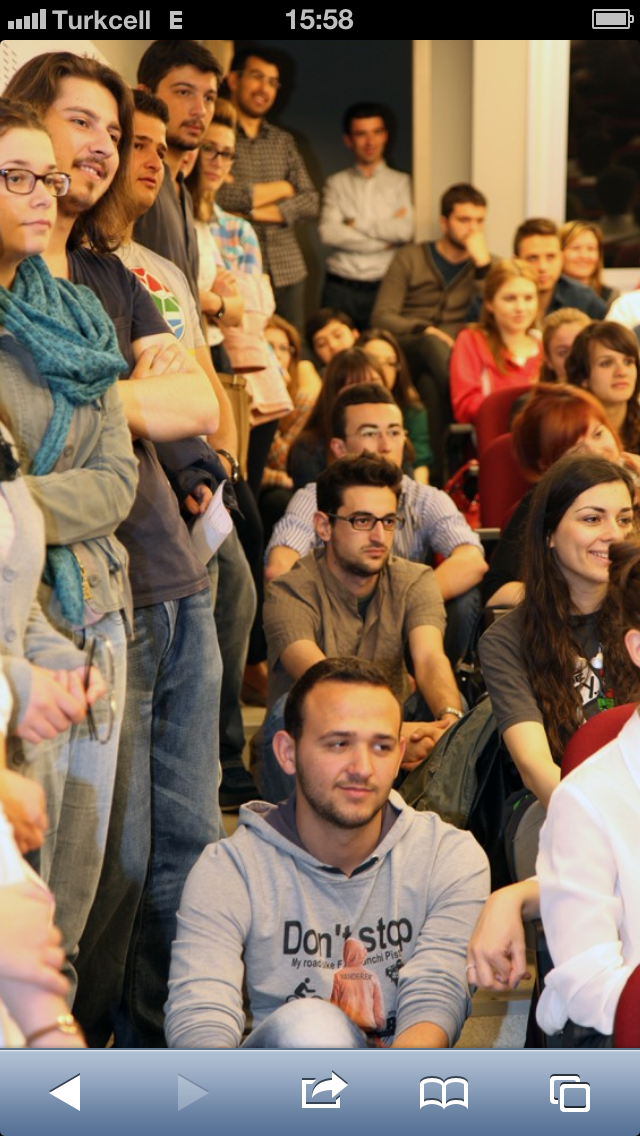 I was a   few minutes late to the opening of the Forum. When l entered the hall, l went   directly to the first row and sat down. My Ambassador, Edmond, sat down just  behind me, in the second row. A few minutes later l understood that the main organizers   of the forum were all sitting on the left side and right side of the first   row, and l was the only one in the middle of the first row. Nobody sat in the   five seats on either side of me. I assumed that some people would come and   sit but nobody did. So l invited Bostjan   Skalarw, the Consul for Economic Affairs in Istanbul, to sit in the chair   next to me. He is a very friendly and serious person who followed all details   of the event from start to finish. He was not happy with the entrepreneurs’   pitches. His wife is from Turkey and he lived in Istanbul for many years, but   he now lives in Slovenia.